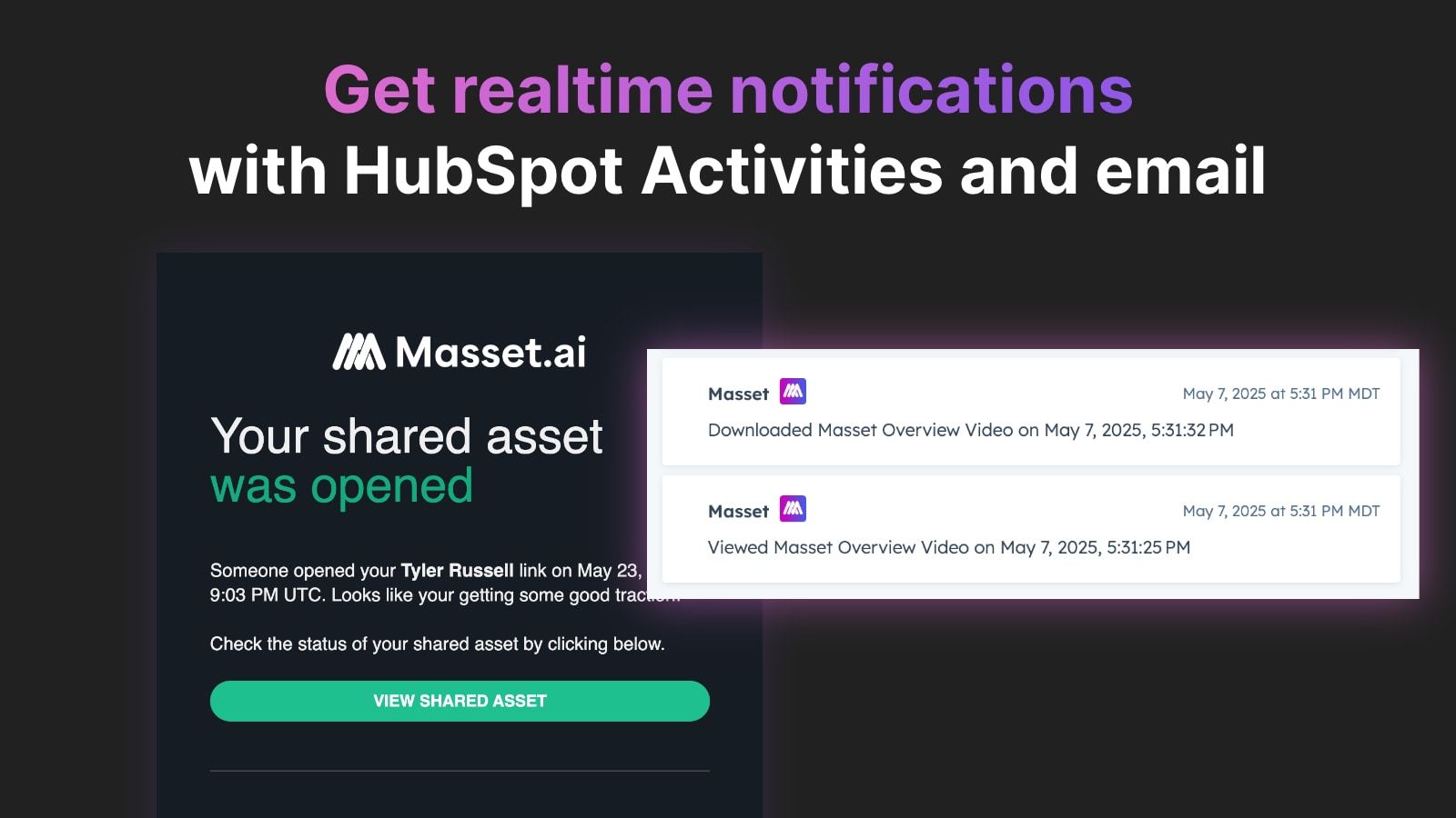 Users can search company assets they have access to inside Masset. If results are found, they can share them with prospects. Each share is tied to the HubSpot Object, and actions like opens, shares, or downloads are tracked to the HubSpot Timeline. - Inside Masset: