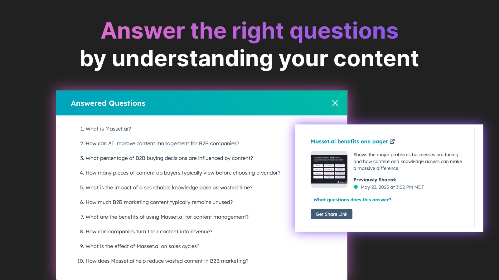 Let your Sales and Marketing teams find the content most likely to help their prospects directly inside of HubSpot. Powered by Masset’s AI analysis, results are tailored to your prospect’s needs and what will help them progress.